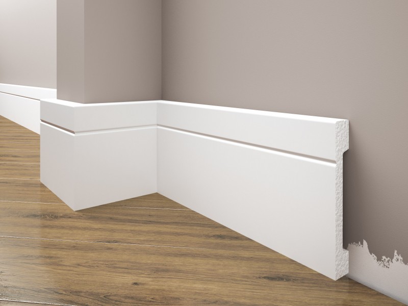 Nowoczesna, biała, matowa listwa przypodłogowa.